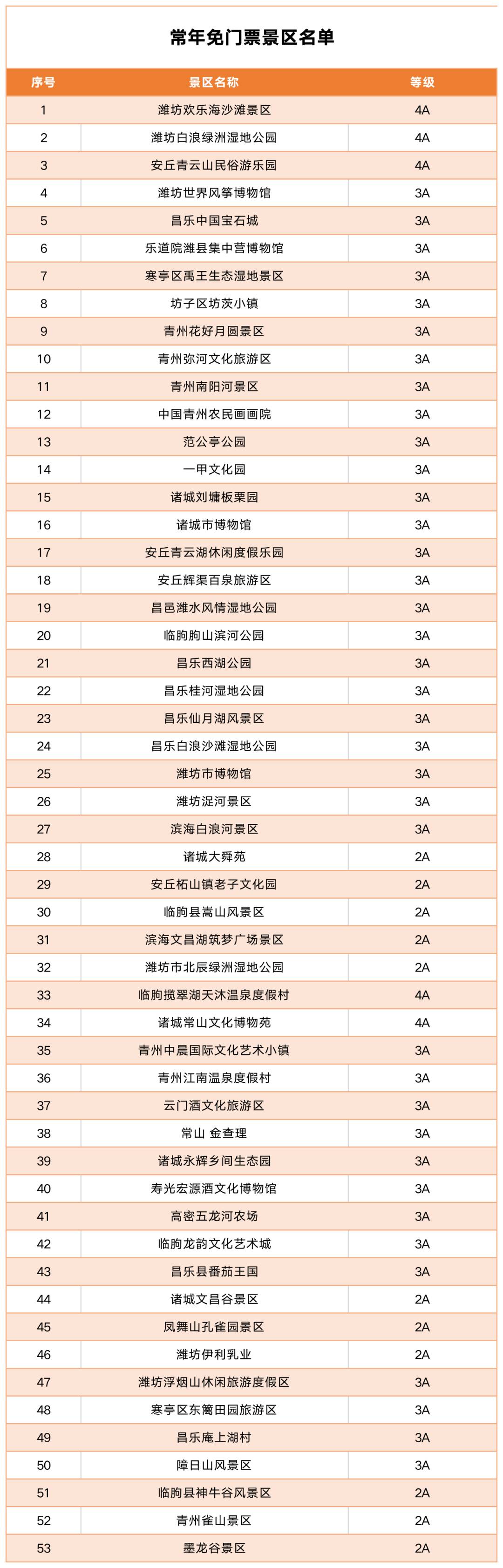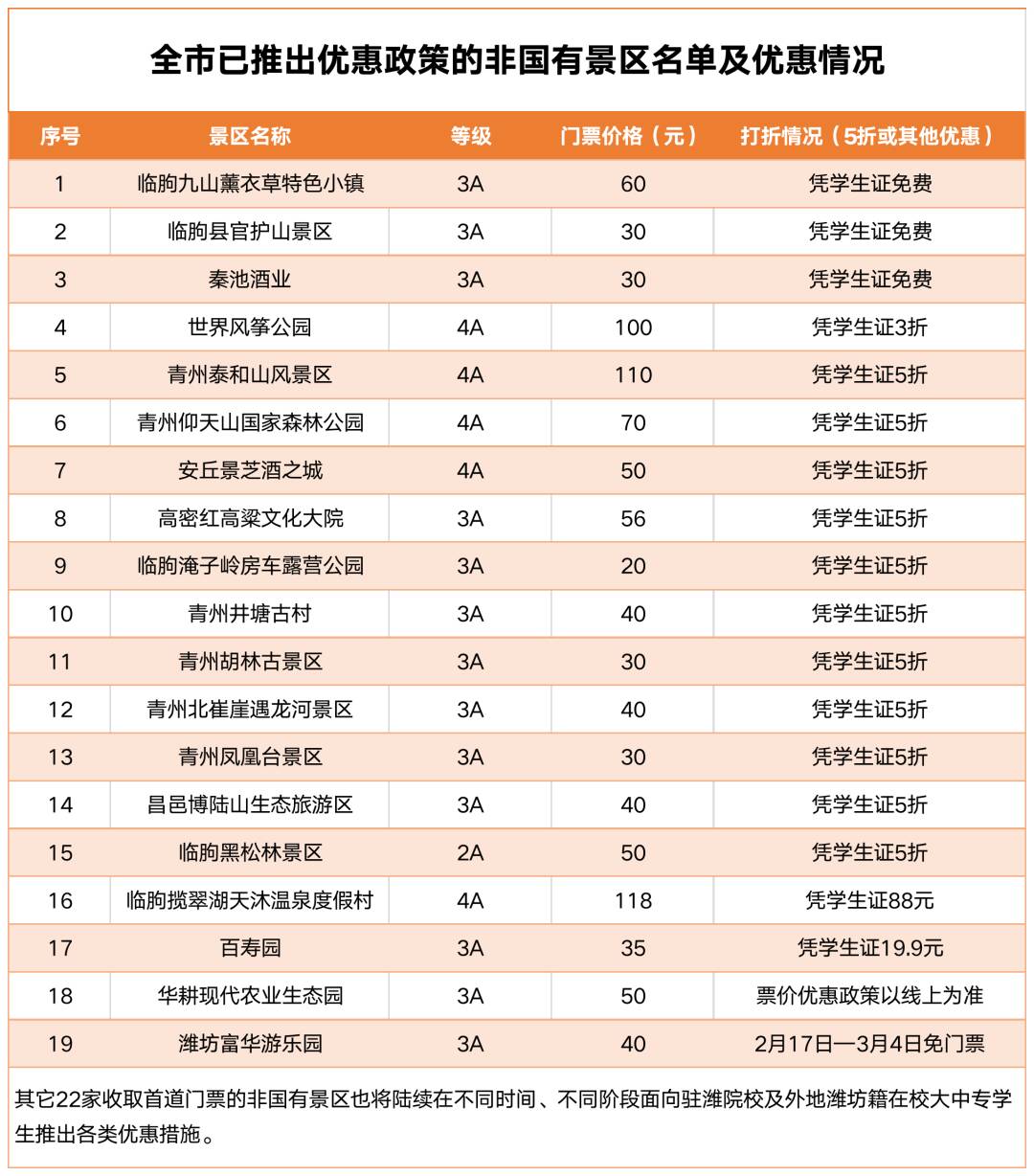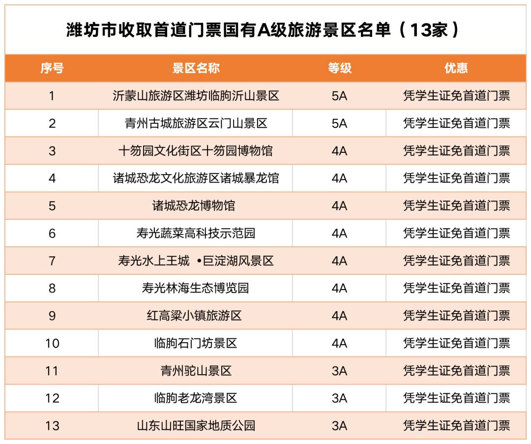 此次政策是潍坊文旅惠民活动的延续与升级,为青年学生群体畅游潍坊、领略本地自然景观与人文魅力搭建了便捷平台,是深化校地融合、打造青年发展友好型城市的有力抓手,将持续提升潍坊的城市吸引力与美誉度。☆温馨提示:符合条件的学生群体入园时,需出示本人学生证、身份证等有效证件,以便顺利享受对应优惠。现将本次优惠涉及的景区名单及具体措施清单公布如下: